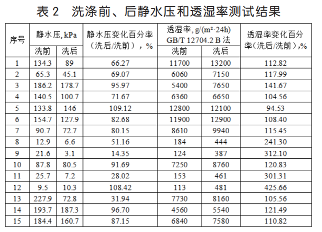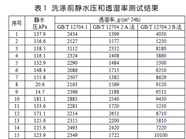 以筆者所在的檢測機(jī)構(gòu)為例,收集了一定時間內(nèi)的沖鋒衣面料檢測樣品,共計 50 個,其中 35 個樣品采用上述方法,進(jìn)行靜水壓和透濕率測試,研究不同方法之間的關(guān)系,結(jié)果見表 1。15 個樣品按照GB/T 32614-2016《戶外運動服裝 沖鋒衣》測試比較樣品洗滌前、后的靜水壓和透濕率變化,結(jié)果見表 2。