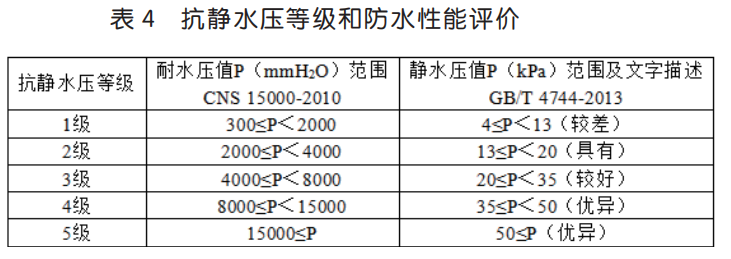 可見,防水透濕面料倒杯 - 蒸發(fā)法的透濕率基本符合正態(tài)分布,≤ 4000g/(m2·24h)的比例為10.0%,> 10000g/(m2·24h)的比例 10.0%,一半以上測試結(jié)果集中在 5000~ 9000 g/(m2·24h)。而靜水壓測試結(jié)果相對比較分散,≤ 30kPa 的比例為 16.0%,> 170kPa 的比例為 12.0%,70% 以上的測試結(jié)果大于 70kPa。以 GB/T 32614-2016《戶外運動服裝 沖鋒衣》中對沖鋒衣面料 I 級功能性要求而言,即洗滌前透濕率≥ 5000g/(m2·24h),靜 水 壓 ≥ 50kPa,50 塊 面 料 透 濕 率 合 格 率 為84.0%,靜水壓合格率為 82.0%,合格率基本一致。但靜水壓指標(biāo)相對更好,三分之二的樣品靜水壓> 100kPa,遠(yuǎn)遠(yuǎn)滿足標(biāo)準(zhǔn)要求,這也驗證了靜水壓指標(biāo)通過在織物表面的涂層處理很容易符合標(biāo)準(zhǔn)要求。將 GB/T 4744-2013《紡織品 防水性能的檢測和評價 靜水壓法》及臺灣標(biāo)準(zhǔn) CNS 15000-2010《防水透濕紡織品性能評估》[8] 對靜水壓的評價性能列如表 4 所示。