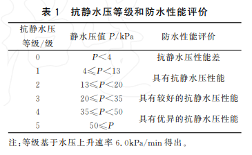 靜態防水性能是指沖鋒衣抵御雨水浸濕滲透的能力。這是沖鋒衣最基礎的功能,可以有效防止雨雪浸入衣服。這一項可以通過量化實驗檢查——對織物一面施加一個持續上升的水柱,直到另一面出現三處滲水點,此時去水柱水壓值。抗靜水壓等級和防水性能評價表見下圖