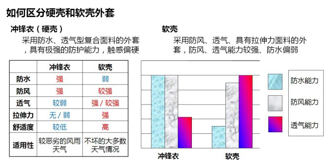 下面從一張圖區(qū)別硬殼軟殼沖鋒衣,簡(jiǎn)單來(lái)說(shuō)硬殼更加戶外專業(yè),功能性更強(qiáng),適合戶外活動(dòng)穿;而軟殼是在原有保暖防風(fēng)面料上增添一個(gè)防水層,功能性差一些,但同樣具備防水性能,適合日常交際穿著。