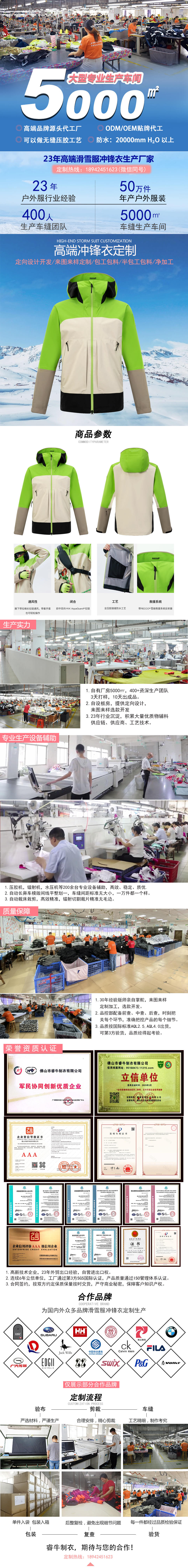 防水拉鏈:硬殼沖鋒衣生產(chǎn)使用YKK防水壓膠拉鏈,承受數(shù)萬次拉合,可根據(jù)客戶的要求進(jìn)行定制特殊配件。