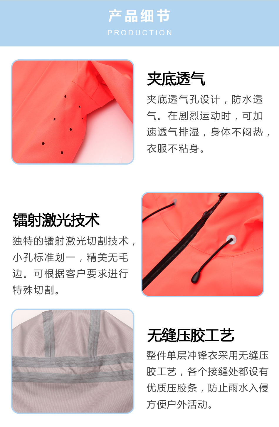 無縫壓膠工藝:整件單層壓膠沖鋒衣采用無縫壓膠工藝,各個(gè)接縫處都設(shè)有優(yōu)質(zhì)壓膠條,防止雨水入侵方便戶外活動(dòng)。