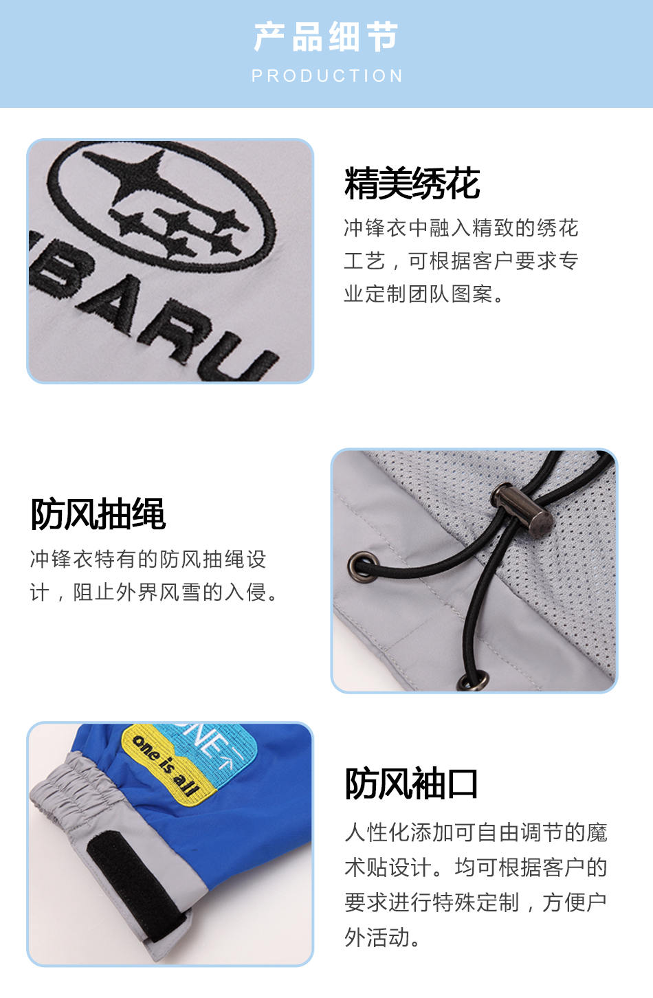 精美繡花:沖鋒衣中融入精致的繡花工藝,可根據(jù)客戶要求專業(yè)定制沖鋒衣團(tuán)隊(duì)圖案。