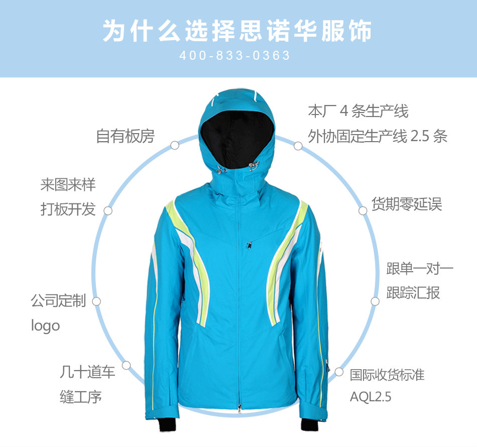 防水拉鏈采用無縫壓膠防水拉鏈激光熱封工藝貼合,面料采用進口防水透氣涂層膜,使防水透氣膜與面料完美結合??筛鶕蛻粜枨?a href="http://m.dpxc.com.cn/oem/" target="_self">生產加工沖鋒衣。