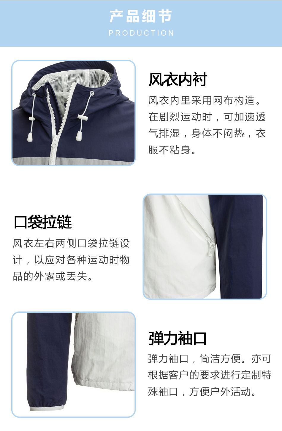 • 風衣內襯:風衣內里采用網布構造。在劇烈運動時,可加速透氣排濕,身體不悶熱,衣服不粘身,專業團體風衣定制