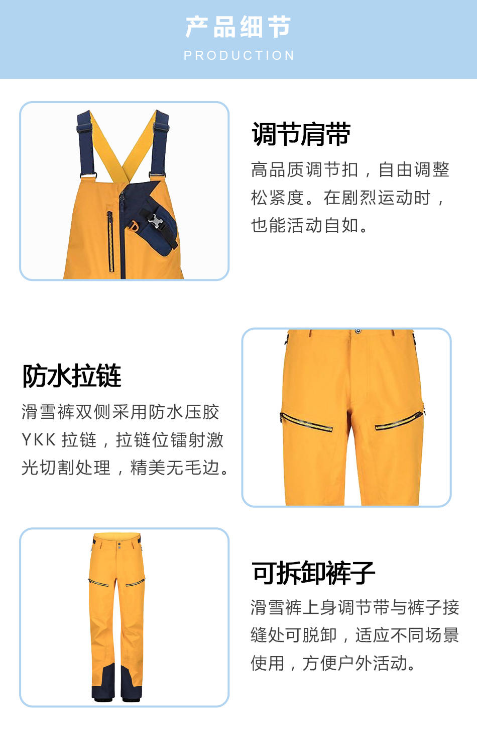 可拆卸褲子:滑雪褲上身調(diào)節(jié)帶與褲子接縫處可脫卸,適應(yīng)不同場景使用,方便戶外活動。