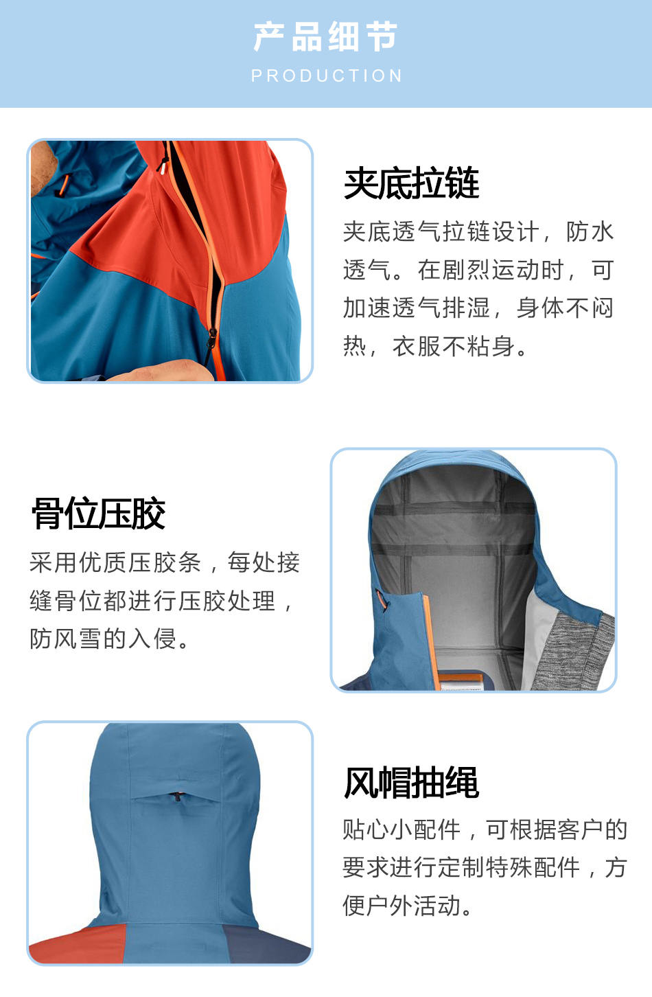 • 夾底拉鏈:夾底透氣拉鏈設計,防水透氣。在劇烈運動時,可加速透氣排濕,身體不悶熱,衣服不粘身,專業戶外滑雪服生產