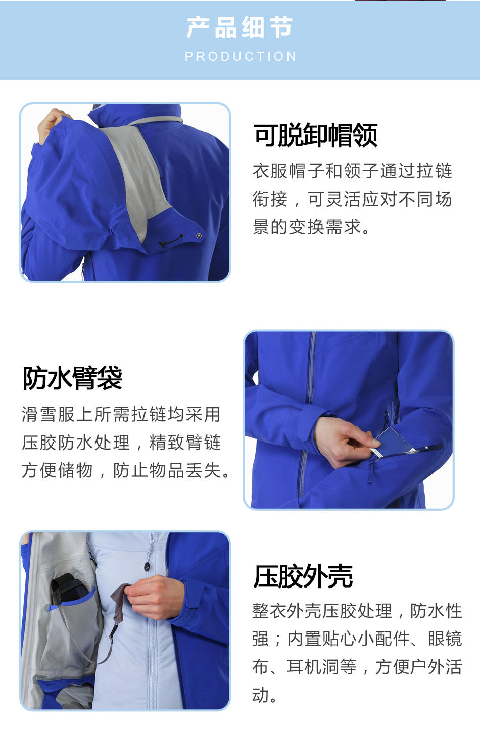 • 壓膠外殼壓膠滑雪服加工整衣外殼壓膠處理,防水性強;內置貼心小配件、眼鏡布、耳機洞等,方便戶外活動。