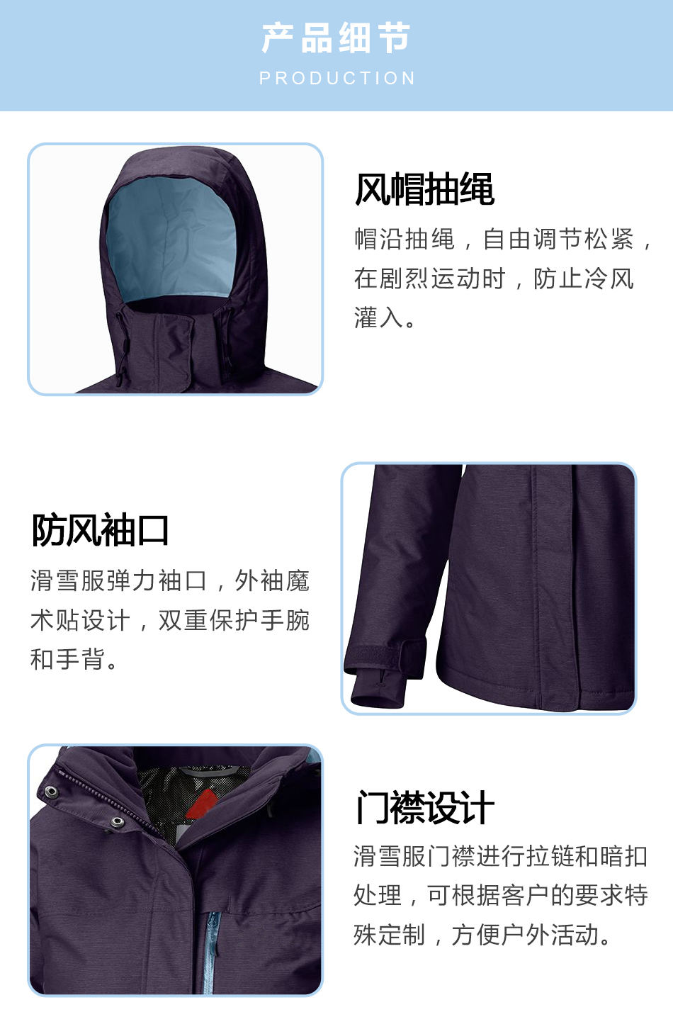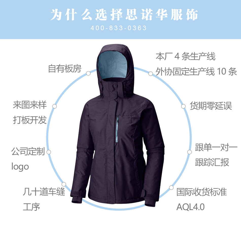 門襟處理:滑雪服生產(chǎn)的門襟進行拉鏈和暗扣處理,可根據(jù)客戶的要求特殊定制,方便戶外活動。